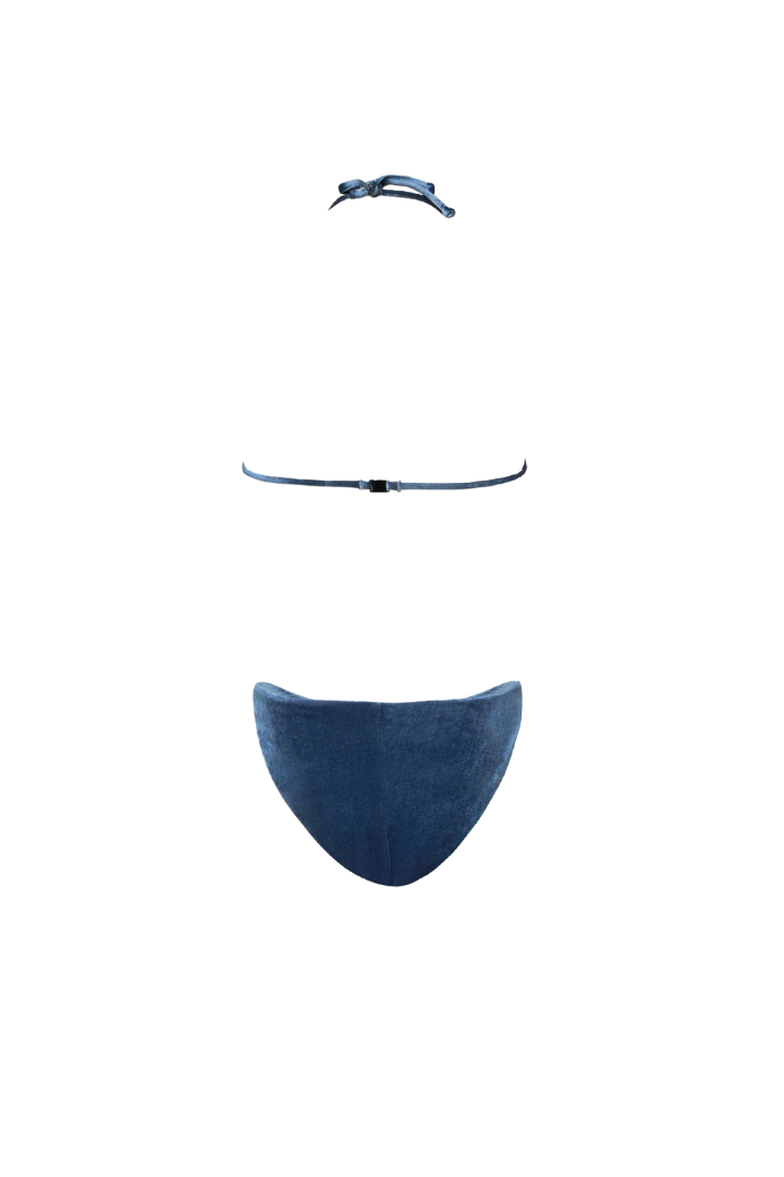 Our most luxurious top, crafted from ocean-blue velvet that shimmers like the sea and changes with the light. With a buckle at the back and adjustable tie around the neck, it offers a customized, secure fit. Perfect for both swimwear and casual wear, this ultra-soft, versatile top combines elegance with all-day comfort.