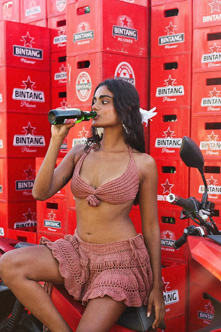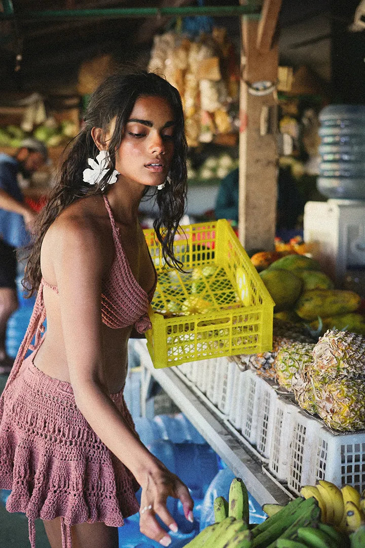 A flirty, handmade crochet mini skirt with layered ruffles and an adjustable waistband. Perfect as a cover-up or worn alone for that breezy island-girl look.